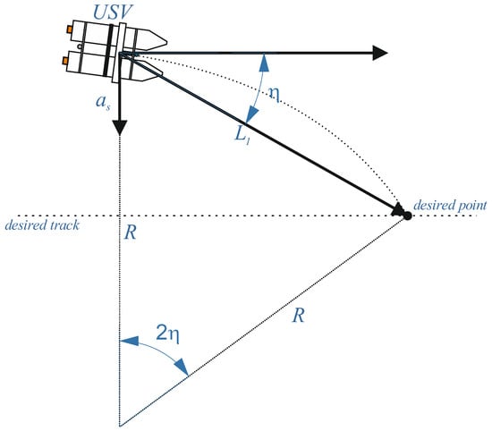 where the lateral acceleration calculated by Equation (1) equals the centripetal acceleration required to follow instantaneously a circular segment and is the property used to track a circle of any radius . This characteristic predisposes the guidance logic to work faithfully with a curved path. Moreover, as shown elsewhere [], the method shows better capabilities than the PID controller when used on the UAV in the presence of wind. In this research, the method will be examined on the unmanned surface vessel (USV) using state-of-the-art geodetic grade measurements. The reference position of the USV was measured using independently acquired GPS navigation data (GPS RTK (Real Time Kinematic) geodetic receiver).