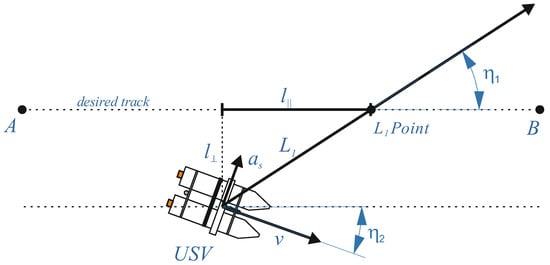 The cross-track error (XTE), corresponding to on Figure 3 and defined as a distance between actual USV position perpendicular to the intended (desired) track, can be approximated as a second order differential equation []: