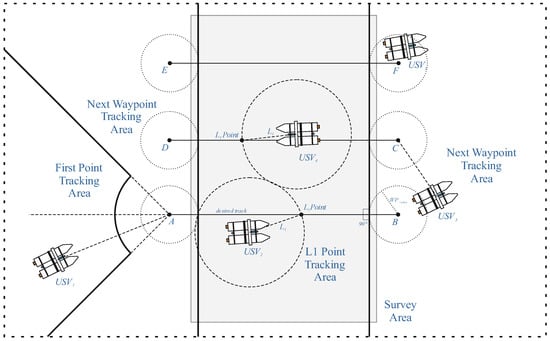 Figure 4 presents all possible tracking movements. The current tracking mode depends on the area where the USV is located in relation to the route plan. Figure 4 presents a simple survey plan based on 6 WPs. When the vehicle is located in , the first WP is acknowledged to be tracked and vehicle i proceeds to point A. The point is considered to be reached when the unit is within the parameter. The is the distance in meters from a WP when the algorithm considers the WP has been reached and determines when the unit will proceed to the next WP. After reaching the first WP, the unit starts the L1 tracking mode (positions , ). In the L1 tracking mode a point L is tracked and this point is dynamically located on the line between the last and next WP. The L point is the intersection point between the track line and the circle with the radius equal to the distance defined by the user. When point B is reached the next WP (C) is acknowledged to be tracked (Next WP Tracking Area). The procedure is repeated until the unit reaches the last WP when it stops and waits for the next command, either from the operator or the autonomous system.