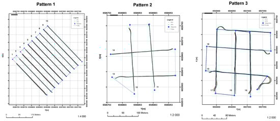 The experiments were divided into three phases. Phase one was data acquisition. In this phase three different patterns were planned and executed. The patterns were planned to represent typical hydrographic surveys based on the present unit (Pattern 1) (Figure 6) and the bottom object investigation plan (Patterns 2 and 3) (Figure 6). All the profiles were numbered in accordance with their execution order. Profiles 1 to 10 belong to pattern no. 1, profiles from 11 to 14 belong to pattern no. 2, and profiles from 15 to 19 belong to pattern no. 3. All data were recorded within their typical hardware configuration, meaning that no additional technical rearrangements of the unit were conducted. The unit in this configuration was prepared to undertake surveys based on best knowledge and practice including use of state-of-the-art hydrographic equipment, therefore, all equipment was calibrated, and all GNSS and INS equipment offsets were measured, and data entered into all hardware units.