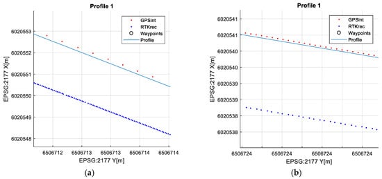 Navigation GPS maximal output frequency was declared as 5 Hz, which means that the GPS position () was reported a maximum of five times per second (Figure 7a). To compare both the registered tracks, i.e., RTK and GPS, the data rate for both RTK and GPS should be the same (Figure 7b). However, the RTK system reported position () with a maximum of 50 points every second and in fact both systems registered tracks at different rates.