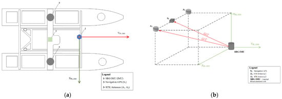 where are the antenna coordinates of the GPS receiver in the national plane rectangular coordinate system, , are the antenna offset values of the GPS antenna unit on the vehicle coordinate system, defined at the center of IMU(RTK) unit with the y axis being parallel to the unit symmetry axis, and the x axis being perpendicular to the y axis, and HDG is the vessel’s actual course reported by the hydrographic system (Figure 9).