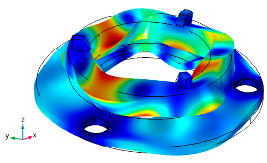 Modal analysis was carried out to find the natural frequencies and modal shapes. Determination of deformations of the actuator in X, Y, and Z directions allow finding resonant frequencies and 3D vibration modes for the rotation of the sphere in all directions. Analysis of the oscillations in a wide frequency range identified several resonance modes when the rotation of the sphere is expected and dominant displacements of the transducer are in radial and axial directions. These types of vibrations generate an elliptical displacement motion of contact points of the ring type transducer and the rotational motion of the sphere is achieved. While analyzing the oscillation modes of the actuator, it was found that the piezoelectric actuator has a mode that is appropriate for the rotation of the sphere. The modal shape at the frequency of 91.15 kHz is shown in Figure 3.