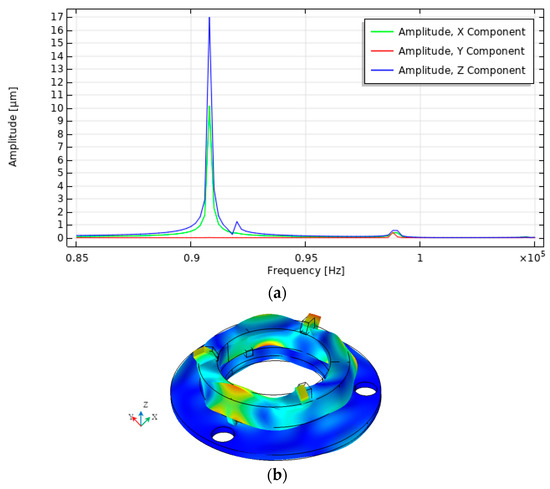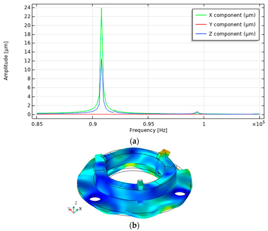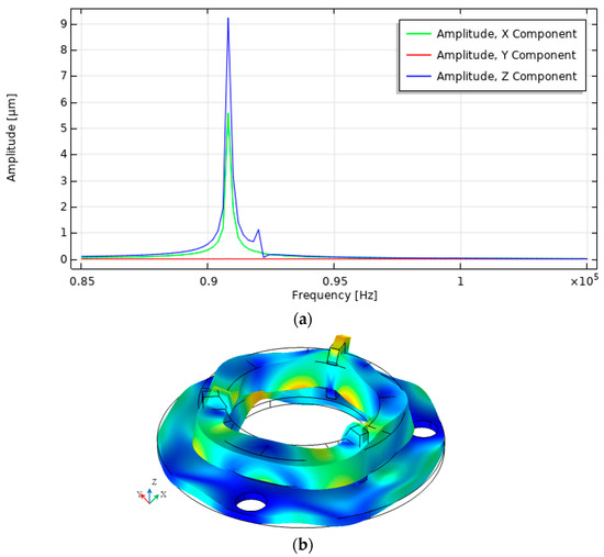 Results of harmonic response analysis when the top electrode is divided into three equal segments; (a) amplitude-frequency characteristic; (b) vibration modes at 90.80 kHz.