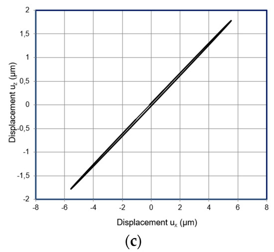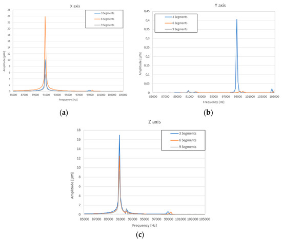 The graphs show that the vibration amplitudes are dominating in X and Z directions and the number of segmented electrodes influences the amplitudes of vibration. The highest oscillation amplitude in X direction equal to 23.9 µm and is achieved when the top electrode is divided into six segments. It is 2.4 times larger value compared to the amplitude obtained when the electrode has three segments. The highest amplitude in Z direction equal to 17.1 µm is obtained when the top electrode is divided into three segments and it is 25% bigger compared to the amplitude when the electrode is divided into six sections. Also, it must be noticed that vibration amplitude in the Y direction is close to zero at the frequency of 90.80 kHz, but the amplitude peak can be seen at the frequency of 99.21 kHz, Figure 7b. The amplitude value at this peak is 0.41 µm and it is much smaller compared to the amplitudes of vibration in X and Z directions shown in Figure 7a,b at the frequency of 90.80 kHz. Also, this peak indicates different vibration mode than is shown in Figure 4, Figure 5 and Figure 6.