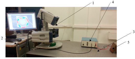 Experimental setup with Polytec Laser Doppler Scanner. 1—PSV-500 3D scanning Head of the vibrometer; 2—PSV-500 3D scanning vibrometer and PC; 3—optical table; 4—amplifier EPA-100 (PiezoSystems Inc., Hopedale, MA, USA); 5—Steel plate with the mounted piezoelectric ring. The piezoelectric ring is mounted on a metal plate and fixed with double-sided adhesive tape.