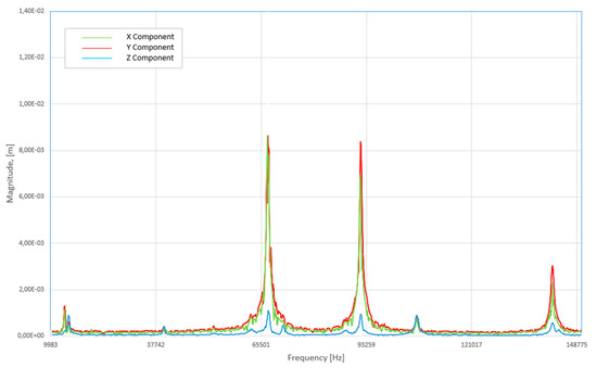 Versus frequency graph with the peak oscillation values at 65 and 91.6 kHz: red—X coordinate, green—Y coordinate, blue—Z coordinate.