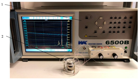 The setup for impedance analysis. 1—Kayne Kerr 6500B impedance analyzer; 2—USM with spherical rotor.