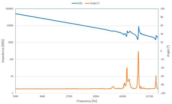 An impedance and phase angle measurement results of piezoelectric transducer, when signal driven electrode is connected.