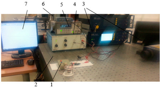 Experimental setup for measurement of resolution of the angular rotation: 1—USM with spherical rotor; 2—controller; 3—Polytec Laser Doppler Vibrometer system OFV512/5000; 4—linear amplifier EPA-104; 5—signal generator Agilent 33220A; 6—oscilloscope PicoScope 3424; 7—PC with a PicoScope and Polytec software.