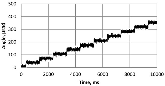 Finally, a harmonic burst type signal of frequency 92 kHz and amplitude 60 V consisted of 20 cycles was applied and resolution of the angular step type rotation of the sphere was measured using laser 1D Polytec vibrometer OFV5000/512. The experimental setup can be seen in Figure 14. A laser beam was pointed to the rotor, which reflected the laser signal. The reflected signal was processed and calculations were done. The results of this measurement are shown in Figure 15. The measured average resolution of the step is 30 µrad.