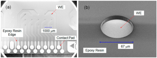 (a) SEM image of one block of the microelectrode array chip, which contained 15 pieces (pcs) of working electrodes (WEs) (top view, ∅67 μm). (b) SEM image of a single WE (45° tilted view, ∅67 μm).