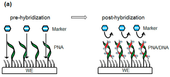 With regard to electrochemical gene sensor array chips based on ion-channel sensing, Aoki et al. [17,18] have discussed the working principle of a sensor with oligonucleotide targets and PNA probes. Before PNA/DNA hybridization, the negatively charged markers can access the electrode and transfer electrons to the WE. After hybridization, the electrostatic repulsion between the negatively charged marker and the PNA/DNA duplexes on the WE surface hinders the redox reaction in the marker. We term the abovementioned mechanism an ordinary sensor working model: this mechanism is depicted in Figure 2a. This working model was established based on the assumption that PNA/DNA duplexes are uniformly spread over the WE.