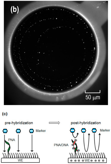 Figure 2b shows the fluorescence hybridization images. The PNA/DNA duplexes were not uniformly spread over the WE but rather exhibited a one-dimensional swirl-like pattern. This fluorescence pattern was considered to be a modified PNA (N1) pattern in which the fluorescently labeled cDNA (D1) was hybridized. The self-assembled 6-HHT monolayer had high orientation and stability [21]. Therefore, the 6-HHT modification after PNA modification may have helped align the PNAs in a swirl-like pattern because PNA is electrically neutral. A large area of the WE did not contain the PNA/DNA duplex. Therefore, the previously mentioned working principle does not explain the mechanism governing the hindrance of the redox reaction over the entire WE.