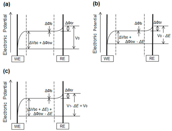 where V0: the external bias to yield (im) in prehybridization; V1: the external bias to retrieve (im) in posthybridization; ΔE: the potential difference caused by the hybridized charge (ΔQ); ΔΦ0r: the potential difference between the RE and the aqueous solution (spontaneous potential); ΔΦb: the potential difference in the bulk aqueous solution (generally close to zero); ΔΦ0w: the potential difference between the WE and the aqueous solution (spontaneous potential); and ΔVb0: the potential difference controlled by external bias (V0).