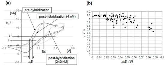 (a) Cyclic voltammograms (CVs) of gold electrodes modified with a PNA probe (N3) and 6-hydroxy-1-hexanthiol (6-HHT). The solid line indicates the prehybridization curve, while the dotted lines indicate the posthybridization curves at 240 nM and 4 nM of miRNA (R3). At 4 nM, the sensitivity of i/i0 was poor, while the sensitivity of ΔE was high. (b) A 74-pc correlation chart for i/i0 and ΔE is shown, representing when the complementary target miRNA (R3) concentration was 4 nM. Compared to the conventional i/i0 evaluation parameter, ΔE has higher sensitivity and is more suitable for detecting low miRNA concentrations.