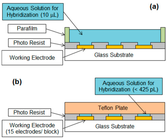 To detect the small amount of miRNA (1.7 amol or less) in the serum through ΔE measurements, the volume of the aqueous solution for hybridization must be limited to 425 pL or less to maintain the concentration at 4 nM. Figure 5 shows a comparison between (a) an ordinary hybridization system and (b) a new hybridization system, where a small well caused by an opening in the epoxy resin and Teflon plate limits the volume of the aqueous solution. This sandwich structure ensures a constant small well volume over each WE and allows for comparing the hybridization results between the WEs. Moreover, the Teflon plate suppresses the evaporation of the aqueous solution during hybridization and prevents the aqueous solution from being removed from each well through capillary forces due to its hydrophobicity property when pressed to the array chip by a metal weight.