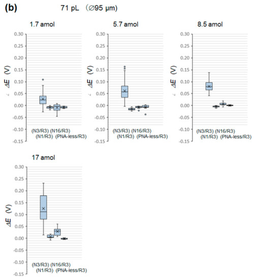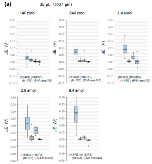 Five of the eight blocks in the array chip were modified using a PNA probe (N3) for complementary miRNA hybridization. Two more blocks were modified by PNA (N1) and (N16) for noncomplementary hybridization. The remaining block was not modified by PNA to check whether there were any target miRNA chemisorbs and remained on the 6-HHT-modified working electrodes. The ΔE detection sensitivity data are box-plotted in Figure 6a (35 pL (∅67 μm)) and Figure 6b (71 pL (∅95 μm)) at various target miRNA molar amounts. In each box plot, (N3/R3) indicates 75 pcs of data of a complementary system, (N1/R3) and (N16/R3) each refer to 15 pcs of data of noncomplementary systems, and (PNA-less/R3) indicates 15 pcs of data of a reference system (to identify the occurrence of the chemisorption of miRNA onto 6-HHT).