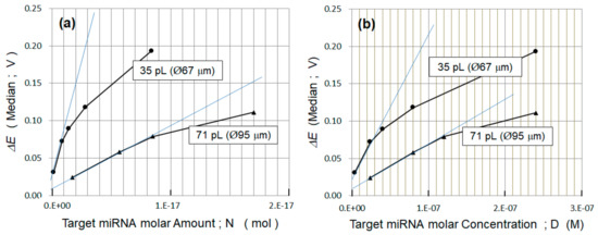 In Figure 7a, the median values of the complementary system (N3/R3) in Figure 6a,b are plotted on a linear scale as a function of the molar amount N. The smaller well volume of 35 pL had the highest ΔE detection sensitivity at 140 zmol. The sensitivity increased with the decrease in the WE size, as predicted in Section 3.4. When ΔE was replotted against the target molar concentration D, the sensitivity to the well volume varied, as shown in Figure 7b. The sensitivity was the highest at 4 nM for the well volume of 35 pL (∅67 μm). In terms of molar concentration, the sensitivity appeared to depend less on the size of the WE, while the sensitivity appeared to depend more on the size of the WE in terms of the molar amount.