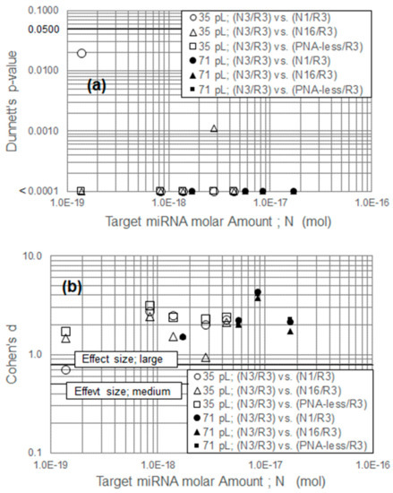 Figure 8a,b shows the calculated Dunnett’s p-value and Cohen’s d-value. Three groups were used for statistical analysis: (N3/R3) versus (N1/R3), (N3/R3) versus (N16/R3), and (N3/R3) versus (PNA-less/R3) for the 35-pL and 71-pL hybridization.