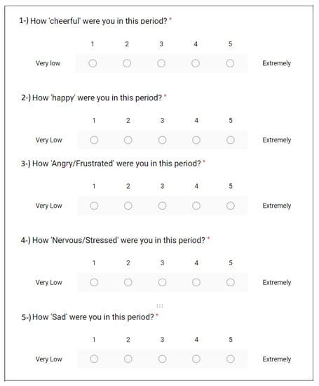 - The participant filled out the PSS-5 (ambulatory PSS) form. This questionnaire was first created by Cohen et al. [] and used for measuring the perceived stress in ambulatory settings in [] (see Figure 1).