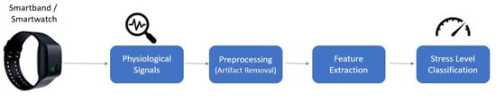 Any potential automated stress detection framework for daily life will be developed using a mechanism that tries to surmount the need for any intervention from a psychologist and making the whole process less incommodious. Due to the disadvantages that self-report questionnaires’ possess, research has emerged detecting regular psychophysiological signs of stress with machine learning (ML) algorithms utilizing the reliable and proven indicators such as response activities of the sympathetic nervous system, skin temperature (ST), electrodermal activity (EDA), and electrocardiogram (ECG) []. The purpose of adopting ML methods for raw psychophysiological objective data is to extract meaningful emotional and affective information. The raw sensor data are collected in this process and transformed into information-containing features. Some of those features would then be used while assigning affective state labels. Subjective data are also recorded by taking records of the known context and/or daily questionnaires and ecological momentary assessments (EMAs). Finally, the primary purpose of the whole process is to train machine learning algorithms to diagnose different types of behavioral and emotional states by using the EMAs, questionnaires, and the known context and test the system using the rest of the features and any feature recorded in the future. Although some of the steps described above are not necessarily required for deep learning models, the whole process for almost all of the traditional machine learning systems is almost the same []. In an automated stress detection scheme, these psychophysiological signals are utilized, and analysis of these signals reveals the frequency and intensity of the stress experienced by the subjects.