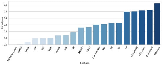 We applied correlation-based feature (CBF) [] selection using the Weka [] tool. The importance of the features is shown in Figure 4. Since our goal was to develop a stress detection model that works in daily life settings, we conducted experiments with the 1 to 20 best features for the DDSR model. We achieved the best results with ten features for HRV + EDA, five features for HRV, and five features for EDA. We applied the classifiers to the selected features.