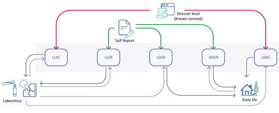 As mentioned, we had two types of class labels in the laboratory environment stress detection experiment: PSS-5 self-reports and the known context (the stressor level). On the other hand, in the wild, we had only self-reports of individuals, which was among the reasons why daily life stress detection performances were low [], and there is still a room for improvement in daily life stress detection research.