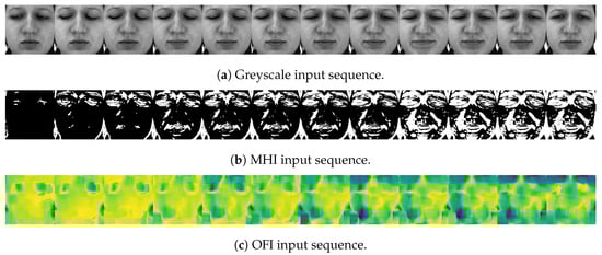 Data preprocessing. Following the detection, alignment, normalisation and extraction of the facial area in each frame of a video sequence, the images are converted into greyscale. MHI and OFI sequences are subsequently generated.