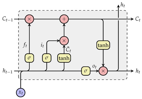 where represents the sigmoid activation function and represents the hyperbolic tangent activation function. The element-wise multiplication operator is represented by the symbol ⊗. The weight matrices for the input are represented by , , and for the input gate, forget gate, output gate and cell state, respectively. Analogously, the weight matrices for the previous hidden state for each gate are represented by , , and . The amount of information to be further propagated into the network is controlled by the forget gate (Equation (11)), the input gate (Equation (12)) and the computed cell state candidate (Equation (13)). These parameters are subsequently used to update the cell state based on the previous cell state (Equation (14)). The output of the cell can subsequently be computed using both Equation (15) and Equation (16).