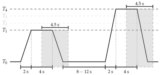 The presented approach is evaluated on both the BioVid Heat Pain Database (Part A) (BVDB) [4] and the SenseEmotion Database (SEDB) [6]. Both datasets were recorded with the principal goal of fostering research in the domain of pain recognition. In both cases, several healthy participants were submitted to a series of individually calibrated heat-induced painful stimuli, using the exact same procedure. Whereas the BVDB consists of 87 individuals submitted to four individually calibrated and gradually increasing levels of heat-induced painful stimuli (, , and ), the SEDB consists of 40 individuals submitted to three individually calibrated and gradually increasing levels of heat-induced stimuli (, and ). Each single level of heat-induced pain stimulation was randomly elicited a total of 20 times for the BVDB and 30 times for the SEDB. Each elicitation lasted 4 s, followed by a recovery phase of a random length of 8 to 12 s during which a baseline temperature () was applied (see Figure 5). Whereas the elicitations were performed uniquely on one specific hand for the BVDB, the experiments were conducted twice for the SEDB, with the elicitation performed each time on one specific arm (left forearm and right forearm). Therefore, with the inclusion of the baseline temperature , the dataset specific to the BVDB consists of a total of samples, whereas the SEDB consists of a total of samples. During the experiments, the demeanour of each participant was recorded using several modalities consisting of video and bio-physiological channels for the BVDB, while the SEDB included audio, video and bio-physiological channels. The current work focuses uniquely on the video modality, and the reader should refer to the work in [10,14,15,16,33,59,60,61,62,63,64] for more experiments including the other recorded modalities.