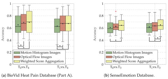 Classification performance (Accuracy). An asterisk (*) indicates a significant performance improvement. The test has been conducted using a Wilcoxon signed rank test with a significance level of 5%. Within each boxplot, the mean and the median classification accuracy are depicted respectively with a dot and a horizontal line.