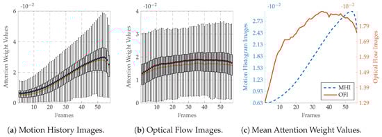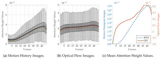 Moreover, to provide more insights into the self attention mechanism, the frame attention weight values computed at each evaluation step during the LOSO cross-validation evaluation process are depicted in Figure 7 for the BVDB and in Figure 8 for the SEDB (uniquely for the classification task vs. , as the results for the classification task vs. are similar). The distribution of the weight values specific to the MHI deep attention models for both databases (Figure 7a,c for the BVDB, Figure 8a,c for the SEDB) is skewed left. It depicts a steady growth of weight values along the temporal axis of each sequence, with the MHIs located at the end of a sequence weighted significantly higher as the others. This is in accordance with the sequential extraction process of MHIs, as each extracted image contains more motion information as the previous one, with the last images accumulating almost the totality of motion information of an entire sequence. Therefore, concerning the actual classification task, the last MHIs are more interesting and relevant than the early images. Thus, such images should be weighted accordingly higher. The designed network is therefore capable of conducting this specific task by using self attention mechanisms.