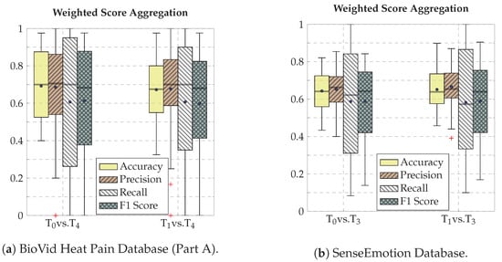Weighted score aggregation classification performance. Within each box plot, the mean and median values of the respective performance evaluation metrics are depicted with a dot and a horizontal line, respectively.