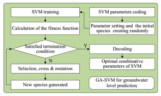 A hybrid model can integrate the advantages of each model. Nowadays, using hybrid models has become popular in modeling and estimating studies. These models combine more than one classifier or use one for estimating and the other for parameter optimization. Based on the previous literature, the hybrid model performs better than the single model []. SVM advances a lot in dealing with the problem of nonlinear regression prediction. However, its generalization performance is sensitive to the selection of the parameters [,,,]. The difficulties in capturing the critical modeling variables are noted as the major drawbacks to SVM []. Hence, it is urgent to apply optimization algorithms to search for the optimal parameters of SVM. The Genetic Algorithms (GA) is an optimization algorithm; it simulates the mechanism of genetic variation and the theory of biological evolution. GA has the advantages of parallelism and global optimization. It has achieved excellent optimization results in plenty of studies [,,]. In the current study, GA was utilized to select and optimize the parameters of SVM.