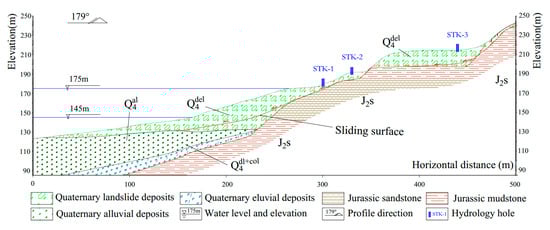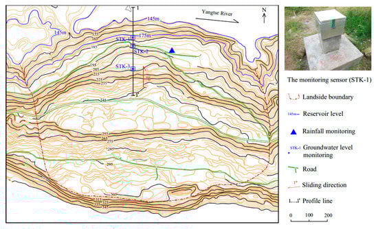 Three groundwater monitoring points (STK) were installed on the Tangjiao landslide. They were respectively labelled as STK-1, STK-2, and STK-3, and their positions are shown on Figure 4, Figure 5 and Figure 8.
