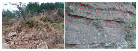 (a) Deposits with rubble and block stones; (b) Bedrock interbedded with sandstones and mudstones.