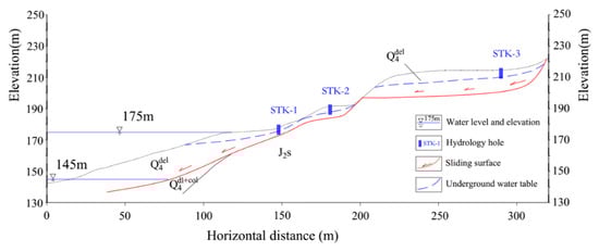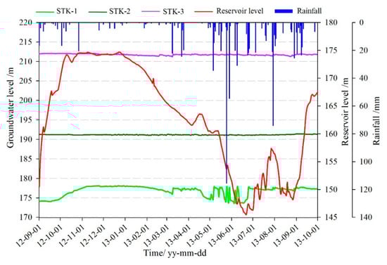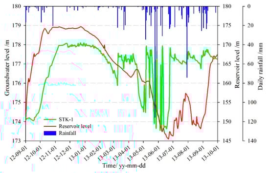 - Between September 2012 and May 2013, the fluctuation of the reservoir level maintained a high degree of consistency with the groundwater level of hydrological hole STK-1. From May to July 2013, the reservoir level was continuously decreasing from 160 m to 145 m, while the groundwater level clearly fluctuated under the influence of rainfall. The reason is that the front part of the landslide is covered by loose deposits, the high permeability of the soil, and the penetrative pressure induced by short-time intensive rainfall make the groundwater recharge quickly by the rainfall. So, the continuous rise of the groundwater level was affected by the rainfall more than the reservoir level during this period.