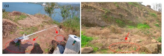 (a) Water exuded on the ground near STK-1; (b) Water exuded on the ground near STK-2.
