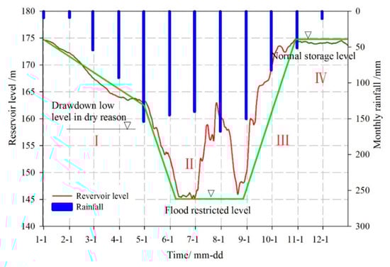 The water-impoundment of the Three Gorges Reservoir has reached full capacity since 2007. The fluctuation of the reservoir level ranges from 145 m to 177 m with a variation of 30 m. The scheduling process is divided into four stages (Figure 11). It makes the hydrogeological conditions of the reservoir area in Wanzhou represent different characteristics in different periods during the year [].