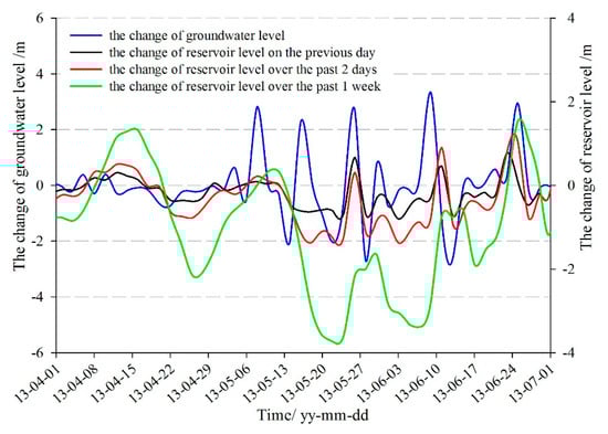 The hydrology hole STK-1 is located on the front part of the Tangjiao landslide at a lower altitude. The soil is loose with large permeability coefficient, so the lag-time, the groundwater response to the reservoir water, is shorter than other parts of the landslide. The monitoring data in Figure 12 and Figure 13 showed that the shape of the change rate curves of the groundwater level in the Tangjiao landslide was similar to that of the change of the reservoir level on the previous day, the change of the reservoir level over the past two days, and the change of the reservoir level over the past one week. Hence, the reservoir level on the current day, the change of the reservoir level on the previous day, the change of the reservoir level over the past two days, and the change of the reservoir level over the past one week were selected as the reservoir level factors of groundwater level.