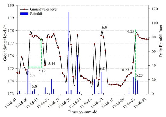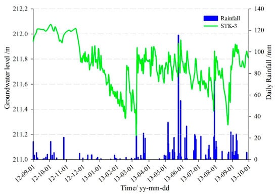 As can be seen from the monitoring curves (Figure 18), the rainfall reached 115 mm/d on 25 May 2013, the groundwater level rose from 211.6 m to 211.9 m, which increased 0.3 m within 24 h. Three days after the rain stopped, the groundwater dropped to 211.7 m again. Then it rose rapidly when the rainfall reached 54.6 mm/d on 29 May. Although the groundwater level of STK-3 fluctuating within a narrow range, it was because of high sensitivity to rainfall.