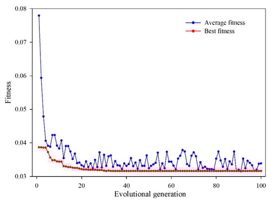 The population of the GA was set as pop = 30 and the maximum iterative steps number was 100. The optimal parameters of the penalty factor and the radial basis kernel function (RBF) were searched by the GA (Figure 15), which was and , respectively. Using the optimal parameters, the multi-factor SVM model was established to find the response relationship between the groundwater level and the influencing factors. The model was trained by the training sample, then the trained model was used to make a prediction of the groundwater level.