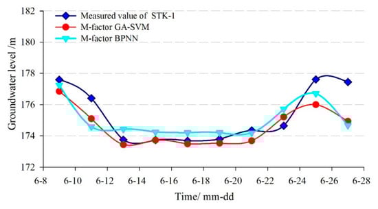 In addition, the single-factor SVM prediction model without considering the factors and the BPNN model were adopted to make a comparative analysis with the proposed multi-factor model. The comparison curves between the predicted and measured groundwater levels are shown in Figure 16 and Figure 17. The evaluation results of the prediction accuracy are shown in Table 2.