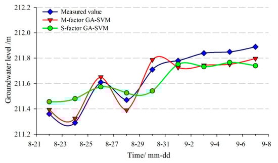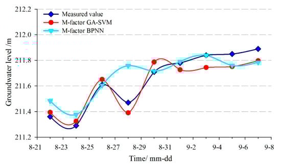 Figure 19 and Figure 20 showed that the goodness-of-fit of the multi-factor GA-SVM model was greater than the single-factor GA-SVM model and the multi-factor BPNN model, especially when the strong rainfall occurred and the groundwater level was fluctuating (24–31 August). The prediction results of the multi-factor GA-SVM model were closer to the measured values. Table 4 shows that the RMSE and the MAPE of the multi-factor GA-SVM model were 0.072 m and 0.032%, while the values of the BPNN model were 0.117 m and 0.0376%, respectively. The correlation coefficient of the former was 0.953; it was greater than the latter (0.860). Compared with the multi-factor models, the RMSE, MAPE, and R of the single-factor GA-SVM model were 0.116 and 0.048%, 0.914, respectively. The prediction results of the multi-factor model were superior to that of the single-factor model. These suggest that based on deep analysis of the geological conditions of landslide and selecting the appropriate factors, an accurate prediction of the groundwater level can be achieved.