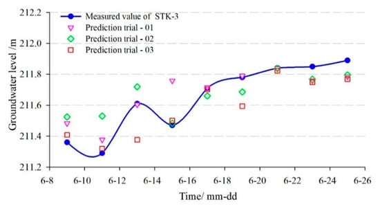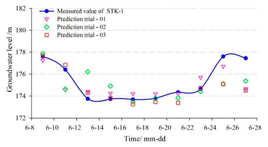 The results show that the groundwater level kept a great consistency of changing tendency with the influencing factors, which was in a valid agreement with the monitoring data. This paper selected the rainfall on the current day, the cumulative rainfall on the previous day, the cumulative rainfall over the past two days, and the cumulative rainfall over the past one week as the influencing factors to predict the groundwater level of STK-3.