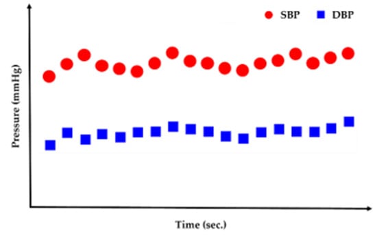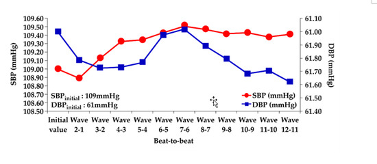 - Sum of initial blood pressure by cuff method and pressure changes by the piezoelectric sensor to achieve beat-to-beat SBP and DBP monitoring, according to Equations (2) and (3) (Figure 2)