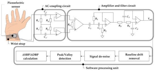 The system can be described in three main parts, including piezoelectric sensor, front-end analog circuit, and software processing unit (Figure 3). The piezoelectric sensor provides a sensing function of pulsation changes of the radial artery that converts pressure signals into electrical signals by the pressure sensitivity of the piezoelectric sensor. The front-end analog circuit is responsible for PPW amplification and filtering. The round piezoelectric sensor and the analog frontend circuit were constructed with geometric dimensions of 2.4 cm in diameter and 5 cm × 7 cm, respectively. The post-processing unit is responsible for detecting SBP and DBP feature points and calculating pressure changes between the adjacent waves.