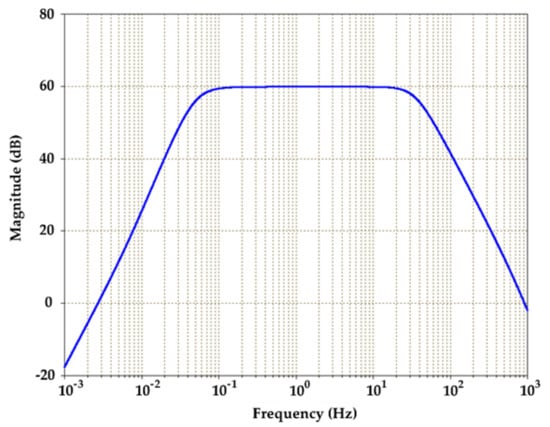 AD620 instrumentation amplifiers (Analog Devices Inc., Norwood, MA, USA) were used for signal amplification with optimal power supply of ±15 V that was provided by the data acquisition (DAQ) device with ±15 V DC power source. The AD620 provides a tunable gain of 1 to 10,000 by an external resistor, according to Equation (5). This study chose the gain of 989 using RG of 50 Ω with a high common-mode rejection ratio (CMRR) of 140 dB. In order to cover PPW signals bandwidth, a combination of a Butterworth high-pass filter (HPF) of 0.05 Hz and low pass filter (LPF) of 35 Hz were implemented, according to Equations (6) and (7). Based on the analysis of hardware functionality, sweeping frequencies from 10−3 Hz to 103 Hz were performed to evaluate the frequency response of the front-end analog circuit. The simulation result performed the required bandwidth (0.05–35 Hz) with an amplification factor of about 59.9 dB and obtained a lower cutoff frequency (fL) of 0.05 Hz and a higher cutoff frequency (fH) of 35.12 Hz (Figure 5).