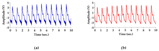 In order to extract clear PPW signals, a front-end analog circuit is required to process signals obtained from the piezoelectric sensor. The front-end analog circuit can be divided into two parts, including the alternating current (AC)-coupling circuit and amplifier circuit. The AC-coupling circuit is responsible for direct current (DC) removal in bio-potential measurements [19] that provides a differential high-pass filter without the grounded resistors to eliminate baseline wandering in front of the amplifier circuit [20]. The AC-coupling circuit was designed with a cutoff frequency of 0.03 Hz, according to Equation (4). In addition, the high impedance voltage followers were behind the AC-coupling circuit to avoid the signals to attenuate.